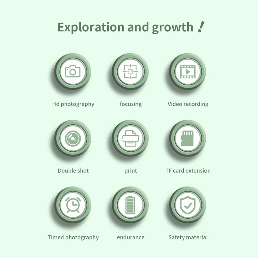 A kid-friendly 1080p HD camera designed to capture videos and photos, encouraging creativity, outdoor exploration, and reducing screen time
